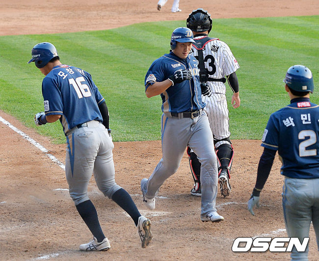 25일 오후 서울 잠실구장에서 열린 2014 한국야쿠르트 세븐 프로야구 포스트시즌 준플레이오프 4차전 LG 트윈스와 NC 다이노스의 경기, 7회초 2사 주자 만루 NC 이호준의 좌익수 앞 2타점 적시타때 모창민과 나성범이 홈을 밟고 있다.