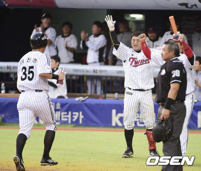 25일 오후 서울 잠실구장에서 열리는 2014 한국야쿠르트 세븐 프로야구 포스트시즌 준플레이오프 4차전 LG 트윈스와 NC 다이노스의 경기, 7회말 무사 주자 만루, LG 오지환의 안타에 홈을 밟은 이진영을 향해 최경철이 만세를 부르고 있다.