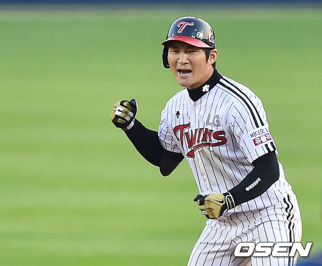 25일 오후 서울 잠실구장에서 열린 2014 한국야쿠르트 세븐 프로야구 포스트시즌 준플레이오프 4차전 LG 트윈스와 NC 다이노스의 경기, 7회말 무사 주자 만루 LG 오지환이 우중간 2타점 적시타를 날린 후 2루에서 기뻐하고 있다.