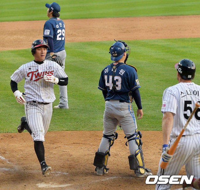 25일 오후 서울 잠실구장에서 열린 2014 한국야쿠르트 세븐 프로야구 포스트시즌 준플레이오프 4차전 LG 트윈스와 NC 다이노스의 경기, 7회말 무사 주자 2,3루 LG 최경철이 중견수 앞 2타점 적시타를 날렸을때 스나이더와 오지환이 홈을 밟고 있다.