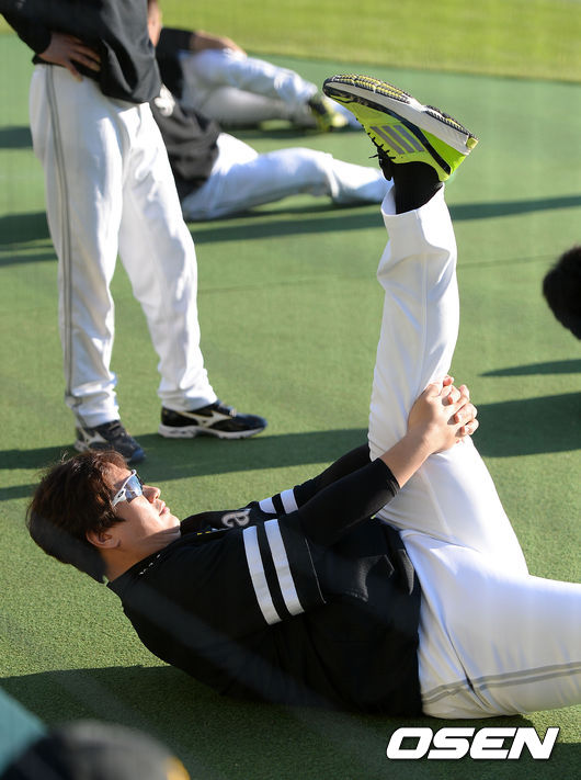 25일 오후 일본 효고현 니시노미야 한신 고시엔 야구장에서 진행될 2014 일본프로야구 일본시리즈 1차전 한신 타이거스와 소프트뱅크 호크스의 경기에 앞서 소프트뱅크 이대호가 훈련을 하고 있다.