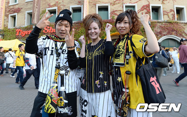 25일 오후 일본 효고현 니시노미야 한신 고시엔 야구장에서 진행될 2014 일본프로야구 일본시리즈 1차전 한신 타이거스와 소프트뱅크 호크스의 경기에 앞서 한신 팬들이 취재진을 향해 포즈를 취하고 있다.
