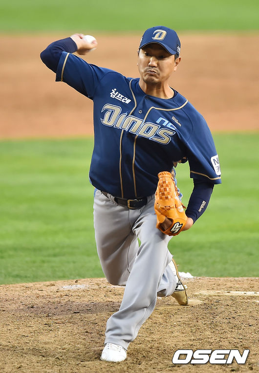 25일 오후 서울 잠실구장에서 열린 2014 한국야쿠르트 세븐 프로야구 포스트시즌 준플레이오프 4차전 LG 트윈스와 NC 다이노스의 경기, 7회말 1사 주자 2,3루 LG 정성훈 타석에서 마운드에 오른 NC 손민한이 힘차게 공을 뿌리고 있다.