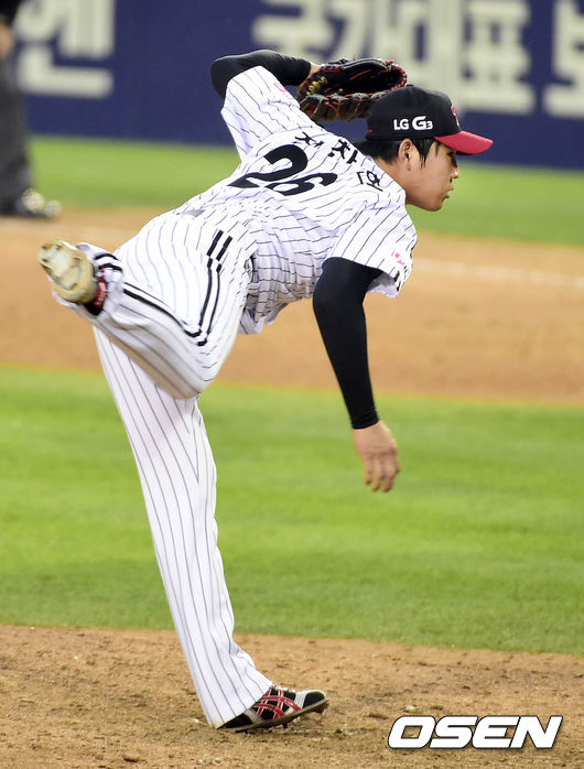 25일 오후 서울 잠실구장에서 열리는 2014 한국야쿠르트 세븐 프로야구 포스트시즌 준플레이오프 4차전 LG 트윈스와 NC 다이노스의 경기, 8회초 LG 정찬헌이 이동현의 뒤를 이어 마운드에 올라 힘차게 공을 던지고 있다.