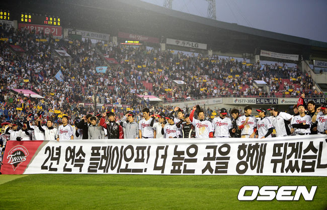 25일 오후 서울 잠실구장에서 열린 2014 한국야쿠르트 세븐 프로야구 포스트시즌 준플레이오프 4차전 LG 트윈스와 NC 다이노스의 경기 종료 후 LG 선수들이 팬들에게 인사를 하고 있다.