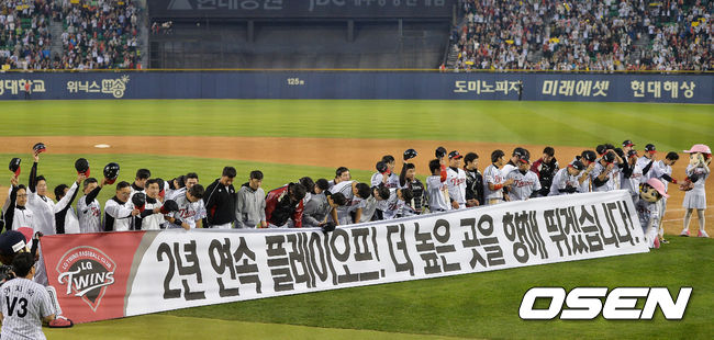25일 오후 서울 잠실구장에서 열린 2014 한국야쿠르트 세븐 프로야구 포스트시즌 준플레이오프 4차전 LG 트윈스와 NC 다이노스의 경기 종료 후 LG 선수들이 팬들에게 인사를 하고 있다.