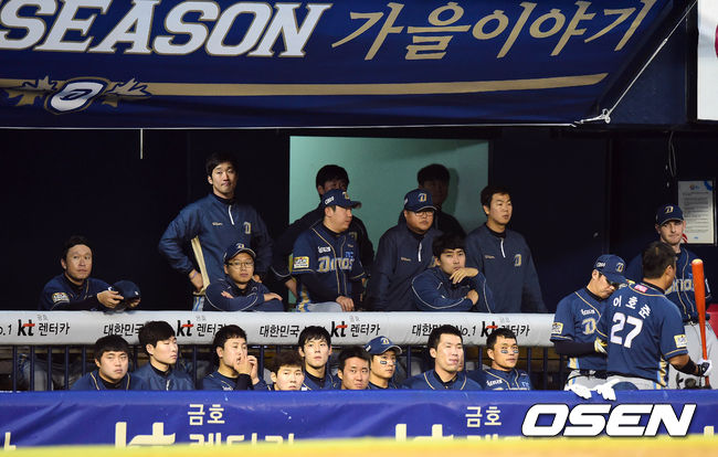 25일 오후 서울 잠실구장에서 열린 2014 한국야쿠르트 세븐 프로야구 포스트시즌 준플레이오프 4차전 LG 트윈스와 NC 다이노스의 경기 종료 직전 NC 선수들이 덕아웃에서 경기를 지켜보고 있다.