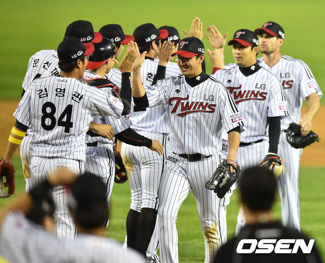 25일 오후 서울 잠실구장에서 열린 2014 한국야쿠르트 세븐 프로야구 포스트시즌 준플레이오프 4차전 LG 트윈스와 NC 다이노스의 경기 종료 후 LG 선수들이 기뻐하고 있다.