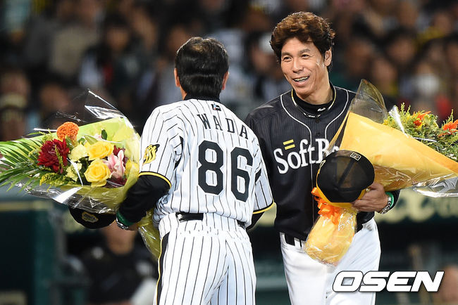 25일 오후 일본 효고현 니시노미야 한신 고시엔 야구장에서 진행될 2014 일본프로야구 일본시리즈 1차전 한신 타이거스와 소프트뱅크 호크스의 경기에 앞서 소프트뱅크 아키야마 고지 감독과 한신 와다 유타카 감독이 인사를 나누고 있다.
