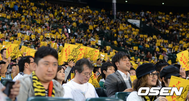 경기에 앞서 한신 팬들이 열띤 응원을 펼치고 있다.