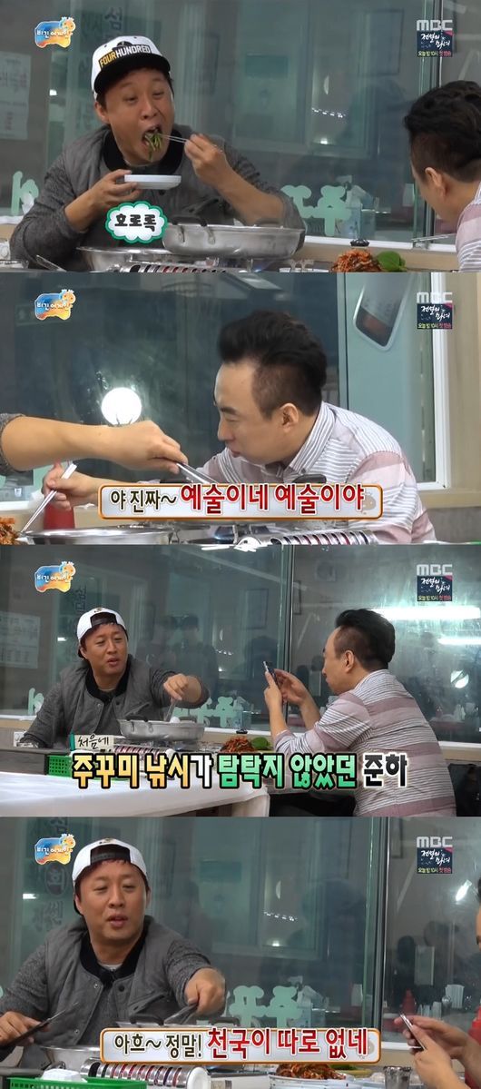 이날 방송에서 메인 요리인 주꾸미 샤브샤브를 맛본 정준하는 "미쳤다. 진짜 맛있다"며 감탄했다. 이어 그는 박명수에게 "진짜 고맙다. 아까까지만 해도 내키지 않았는데 천국이 따로 없다"며 고마움을 전했다.