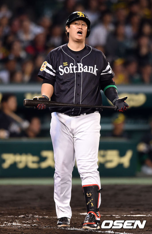 4회초 1사 1루에서 소프트뱅크 이대호가 직선타 아웃으로 물러나며 아쉬운 표정을 짓고 있다.