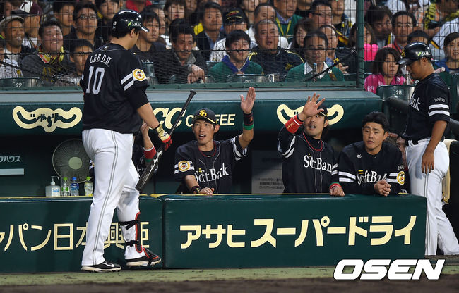 6회초 1사 만루에서 소프트뱅크 이대호가 희생플라이를 치고 더그아웃에서 동료들과 환호하고 있다.