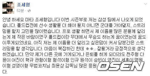 조세형은 "마음이 복잡하긴 한데 ㅎㅎ.. 잘될거라 긍정적으로 생각하겠습니다. 만약 제가 다른 곳에 가게되거나 은퇴를 하게 되더라도 천주형 다윤이 어진이 혁규 관형이형 형석이형 인규 원석이 승빈이 영진이 세훈이 명원이형 성영이형 우범코치님 최윤상 감독님 많은 응원 부탁드립니다. 감사합니다"라고 팬들에게 삼성 화이트를 떠나는 소회를 전했다.