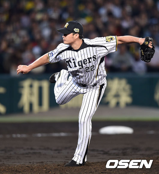 9회초 무사에서 한신 오승환이 힘차게 공을 던지고 있다.