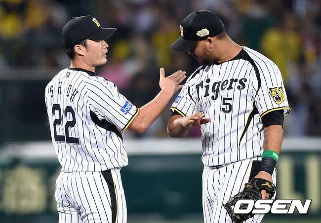 경기 종료 후 한신 오승환이 동료들과 승리의 기쁨을 나누고 있다. /sunday@osen.co.kr