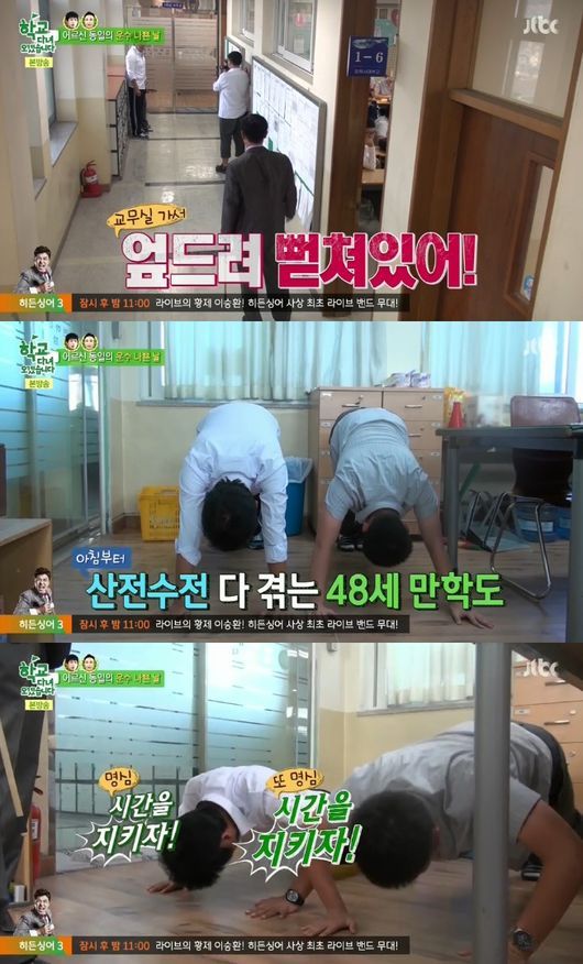 성동일은 당황해하며 교무실에 가서 엎드려뻗쳐를 하고 있다가 푸시업까지 해 웃음을 자아냈다.