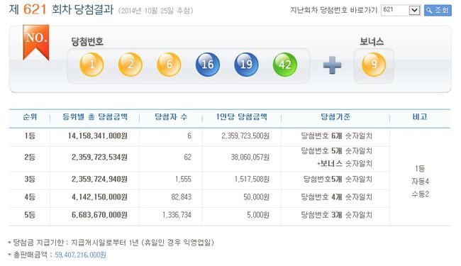 594억 721만 6000원의 총 판매금액을 기록한 로또621회당첨번호는 1, 2, 6, 16, 19, 42가 뽑혀 총 141억 5834만 1000원의 상금이 1등에게 지급될 예정이다.