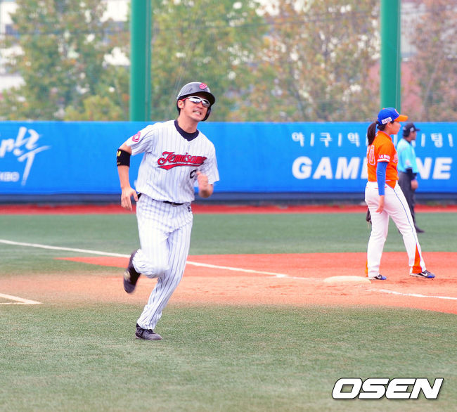 8-1로 앞서던 4회 타석에서 우전 안타를 때려 나간 재미삼아 안재욱이 후속 정태우의 안타 때 홈으로 질주하고 있다.