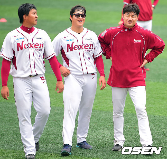 26일 서울 목동구장에서 열린 2014 한국야쿠르트 세븐 프로야구 포스트시즌 플레이오프 넥센과 LG의 미디어 데이에 앞서 넥센 김영민과 조상우, 손승락이 훈련중 미소 짓고 있다.