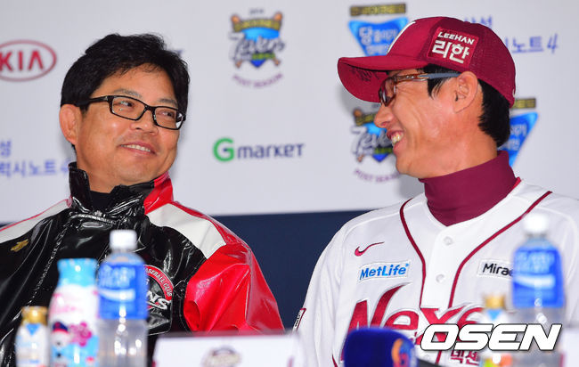26일 서울 목동구장에서 열린 2014 한국야쿠르트 세븐 프로야구 포스트시즌 플레이오프 넥센과 LG의 미디어 데이에 LG 양상문 감독이 이택근과 강정호의 도발에 노려보고 있다.