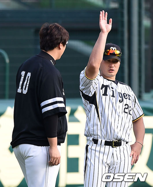 26일 오후 일본 효고현 니시노미야 한신 고시엔 야구장에서 열릴 2014 일본프로야구 일본시리즈 2차전 한신 타이거즈와 소프트뱅크 호크스의 경기에 앞서 소프트뱅크 이대호와 한신 오승환이 이야기를 나누고 있다.