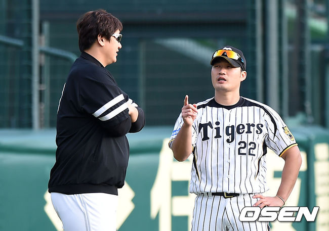 26일 오후 일본 효고현 니시노미야 한신 고시엔 야구장에서 열릴 2014 일본프로야구 일본시리즈 2차전 한신 타이거즈와 소프트뱅크 호크스의 경기에 앞서 소프트뱅크 이대호와 한신 오승환이 이야기를 나누고 있다.