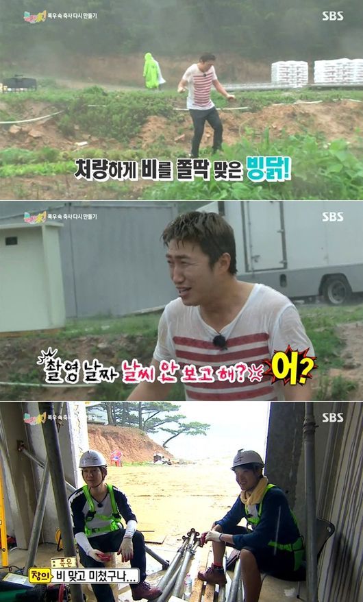 하지만 아직 작업이 한참 남았을 때 비가 쏟아지기 시작했다. 흙에 퇴비를 뿌리던 장동민은 “촬영 날짜 날씨 안 보고 하냐”며 버럭 소리를 질러 웃음을 자아냈다. 이를 들은 벽체 팀 송창의와 정겨운은 장동민에 대해 “비 맞고 미쳤구나”라며 웃었다.