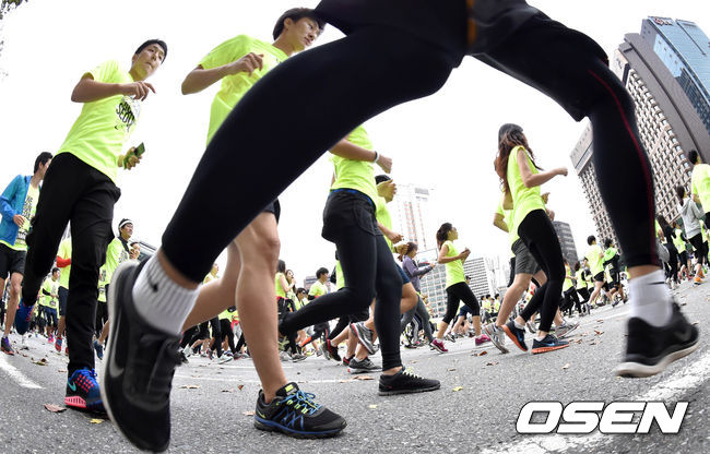 전 세계 14개 도시에서 14만 명의 러너들이 참여하는 최대 규모의 글로벌 러닝축제 ‘2014 나이키 위런서울(NIKE WE RUN SEOUL)’이 26일 서울 광화문 세종대로에서 개최, 참가자들이 스타트라인을 힘차게 출발하고 있다.