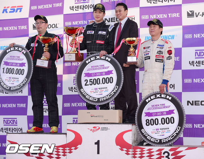 GT-300 1위 서주형, 2위 이한준, 3위이동호가 넥센타이어 최상규 마케팅 팀장과 포토타임을 갖고 있다./ ajyoung@osen.co.kr