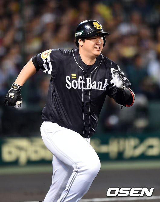 1회초 1사 1루에서 소프트뱅크 이대호가 병살타를 치고 그라운드를 달리고 있다.