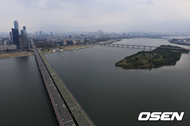 참가자들이 마포대교에서 레이스를 펼치고 있다.