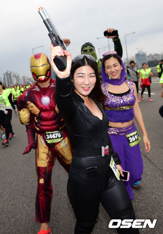 커스튬 복장을 한 참가자들이 마포대교에서 포즈를 취하고 있다.