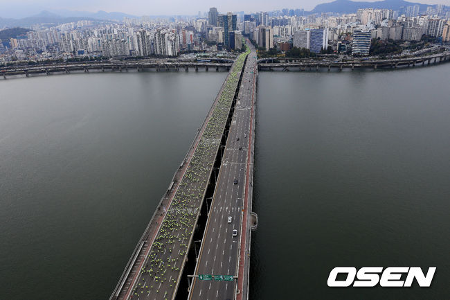 참가자들이 마포대교에서 레이스를 펼치고 있다.