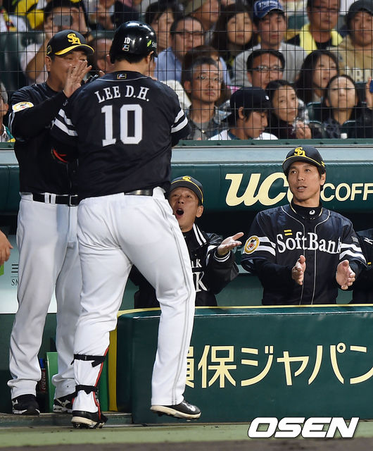 4회초 1사에서 소프트뱅크 이대호가 좌월 솔로 홈런을 치고 더그아웃에서 아키야마 고지 감독과 하이파이브를 하고 있다.