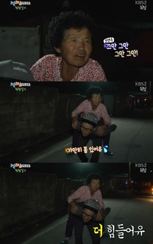 이날 김준호는 배말례 할머니를 업었다. 할머니는 김준호가 등을 내밀어도 “됐다”고 말했지만, “그럼 기어가겠다”고 말하는 김준호를 이길 수 없어 등에 업혔다.
