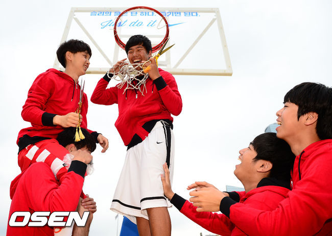 바스켓볼 3on3 고등부 대학부 우승팀이 우승 세리머니를 하고 있다.
