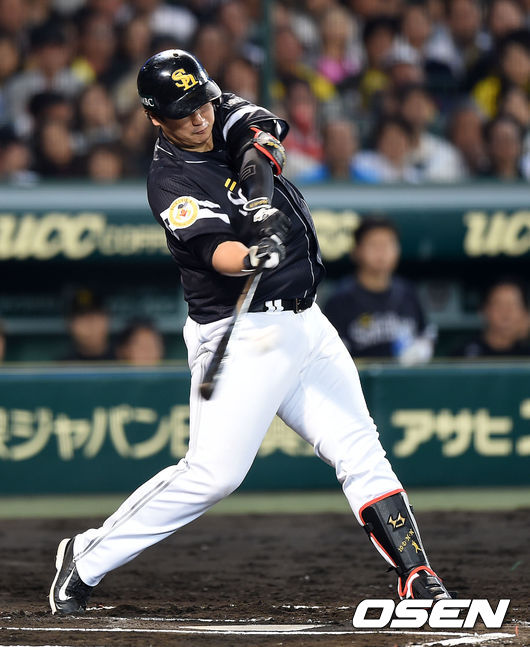 6회초 1사 2루에서 소프트뱅크 이대호가 외야플라이를 치고 있다.