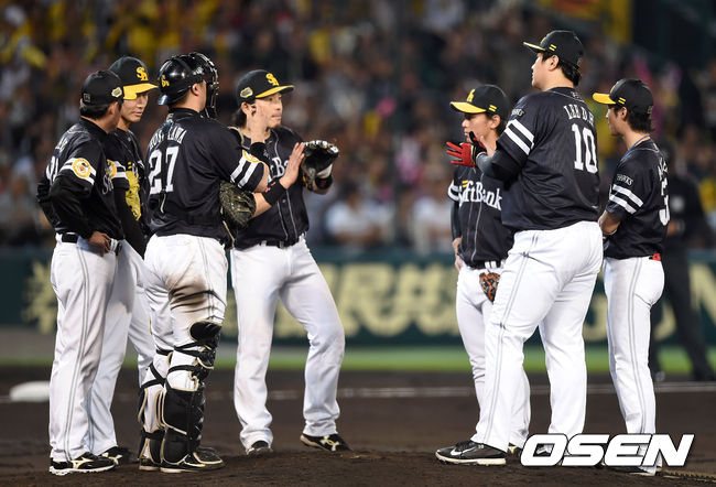 6회말 2사 2루 한신 우에모토 히로키 타석때 마운드를 방문한 소프트뱅크 선수들이 이야기를 나누고 있다.