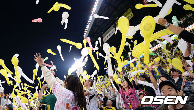 7회초 종료 후 한신 팬들이 풍선을 불어 하늘로 날리고 있다.