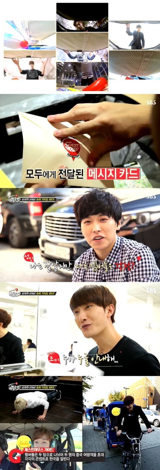 이어 멤버들은 ‘중국어 팬들에게 한국을 관광시켜줄 것’이란 메시지 카드를 받고 각기 다양한 반응을 보여 웃음을 자아냈다. 성민은 “저는 자신 있다. 그러나 다른 멤버들은 걱정 된다”고 자신만만한 모습을 보였고, 헨리는 “제가 한국에 8년을 살았지만 저도 아직 잘 모른다”고 말했다.