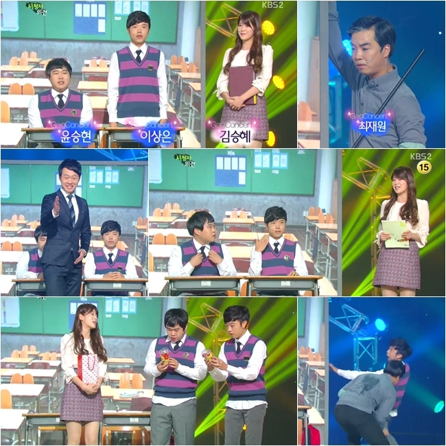 지난 26일 KBS 2TV '개그콘서트'에는 새 코너 ‘시청자 의견’이 공개됐다. 정재형은 “최근 인기리에 방송된 ‘사랑이 꽃피는 교실’에 비현실적인 장면이 있다는 시청자 의견이 있다”고 운을 떼며 김승혜와 최재원이 선생님으로 등장하는 극과 극 상황을 소개했다.