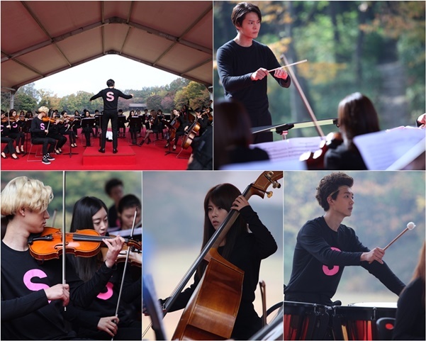 공개된 사진 속에는 등에 S가 새겨진 검은색 티셔츠를 입고 지휘를 하고 있는 주원의 모습이 담겨져 있어 눈길을 끈다. 그간 여들의 로망답게 각 잡힌 와이셔츠만 고집하던 그가 지휘자로서의 데뷔 무대에서 과감하게 의상 체인지를 시도한 것. 연주곡인 ‘영웅’에 맞춰 웅장함이 느껴지는 지휘를 선보이는 그의 얼굴 위로 비장함이 감돈다. 또 주원과는 반대로 가슴에 S가 새겨진 티셔츠를 입은 고경표와 장세현이 그 어느 때보다 진지한 모습으로 연주에 임하고 있다.