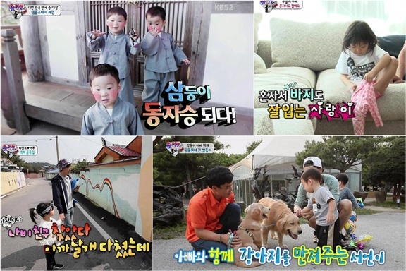 아빠와 남도 여행을 간 하루는 골목길에서 날개가 부러져 날지 못하는 나비를 발견하고는 “나비 친구들이 도와줄 거”라며 나비를 부르기 시작했다. 이어 길을 걷다가 또 다른 나비를 발견하자 “도와주러 왔다”며 기뻐하는 순수한 모습으로 시청자들을 미소 짓게 했다. 또 아빠 송일국과 템플스테이를 한 삼둥이의 큰형 대한은 거미를 보며 “거미야 안녕”이라고 인사를 건네는 모습에서 아이들의 동심을 다시 한번 느끼게 했다.
