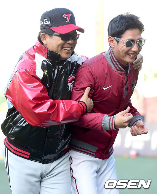 경기에 앞서 넥센 염경엽 감독과 LG 양상문 감독이 인사를 나누고 있다.