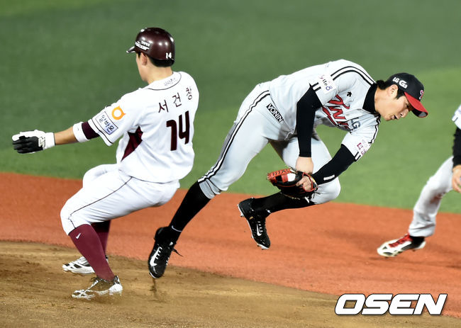 1회말 무사 1루에서 LG 오지환이 넥센 이택근의 2루땅볼에 서건창을 태그하며 중심을 잃고 있다. 이택근 병살.