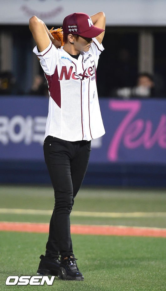 27일 오후 서울 목동야구장에서 열린 '2014 한국야쿠르트 세븐 프로야구' 넥센 히어로즈와 LG 트윈스의 플레이오프 1차전 경기에 앞서 보이그룹 빅스 엔이 시구를 하고 있다