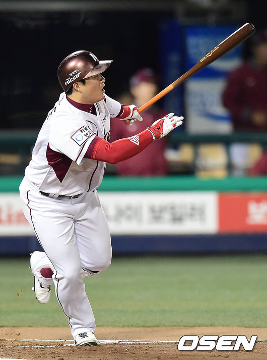 2회말 넥센 공격 1사 만루 상황 박헌도가 선제 1타점 좌전안타를 날리고 있다.