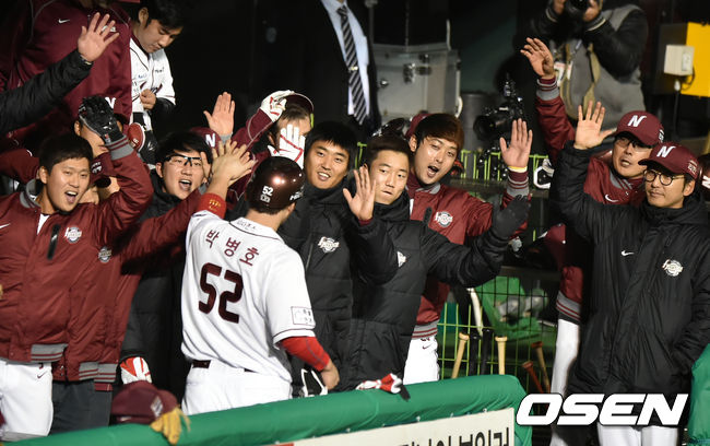 2회말 1사 만루에서 넥센 박헌도의 선취 1타점 좌중간 적시타에 박병호가 홈을 밟고 더그아웃에서 동료선수들과 기뻐하고 있다.
