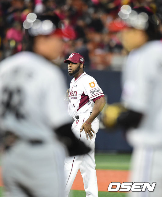 3회초 LG 공격 무사 1, 2루 상황 김용의의 내야 안타 때 송구에 실패한 넥센 선발 소사가 아쉬워하고 있다.